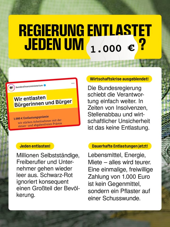Eine Klarstellung: Die Bundesregierung („Wir“) entlastet hier niemanden. Dabei wäre dies nun dringender denn je. Die Menschen haben dauerhaft niedrigere Steuern und Abgaben verdient – damit am Ende des Monat mehr vom Erarbeiteten übrig bleibt.